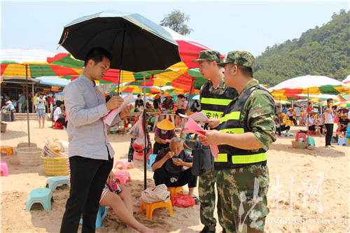 ????在天氣越來越熱的夏季,“海邊游”受到越來越多游客的追捧和青睞。尤其正值暑期,許多游客選擇帶小孩到海邊避暑。為使游客玩得舒心和盡興,廣西公安邊防總隊防城港邊防支隊江山邊防派出所針對夏季旅游景點(diǎn)溺水、小孩走失等易發(fā)多發(fā)的實際,組織官兵深入轄區(qū)景點(diǎn)開展安全宣傳活動。