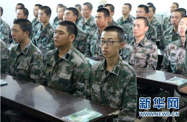 ????資料圖片: 2017年10月2日,在駐守在遼東半島的第79集團(tuán)軍某旅新兵營(yíng),蔚晨陽(yáng)(前右一)在認(rèn)真聽(tīng)課。新華社發(fā)(王立軍 攝)