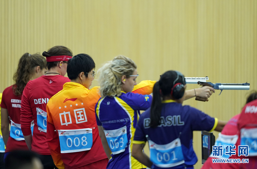 10月21日,中國隊選手王佳(左三)在比賽中。 當日,在武漢舉行的第七屆世界軍人運動會空軍五項女子射擊比賽中,中國隊選手王佳獲得第一名。 新華社記者金良快攝