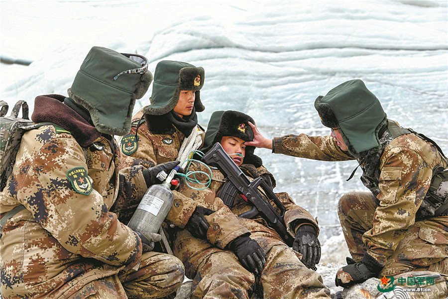 巡邏途中,一名戰士因高原反應接受吸氧急救。