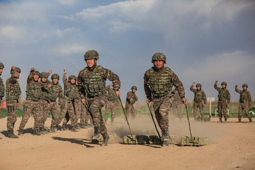 ????武警新疆總隊某機動支隊特戰(zhàn)一中隊組織官兵進行搬運子彈箱體能訓練(10月30日攝)。新華社發(fā)(張文 攝)