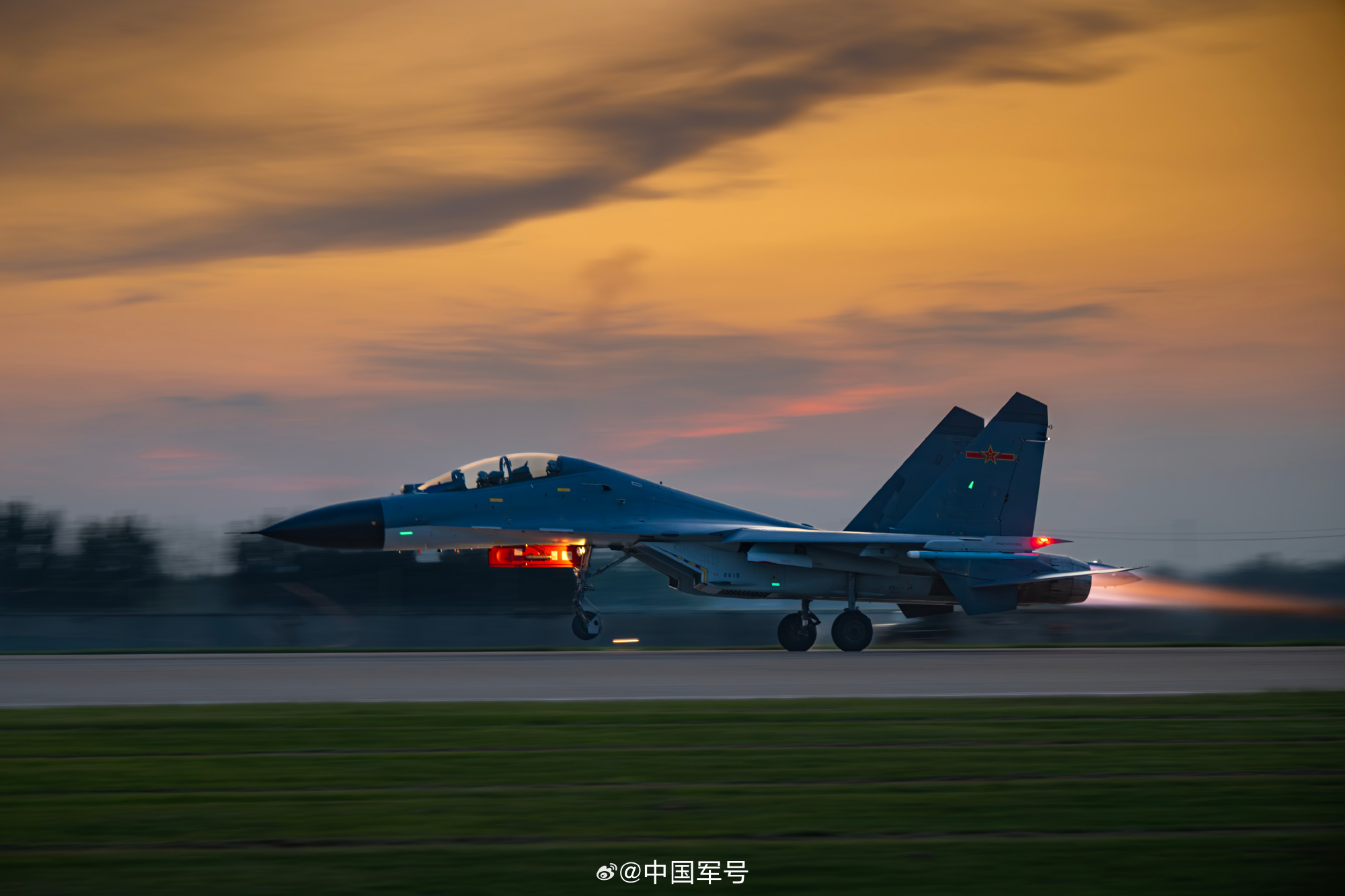 战机在夕阳下拖着尾焰呼啸升空