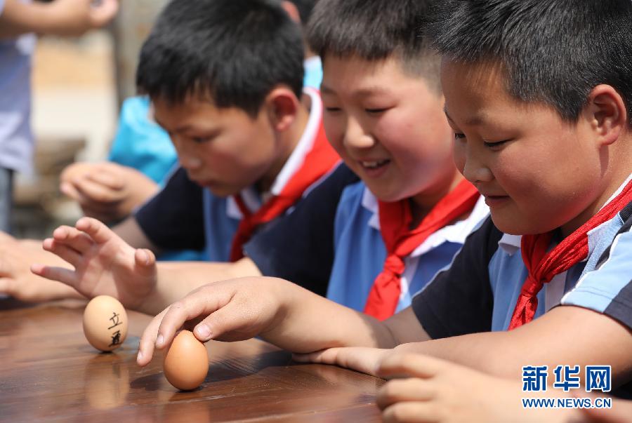 5月5日,在浙江杭州臨安區天目山鎮武山村,幾名小學生在體驗“立蛋”的傳統習俗。立夏節氣將至,人們參加繪彩蛋、稱體重等活動,體驗傳統民俗。新華社發(胡劍歡 攝)