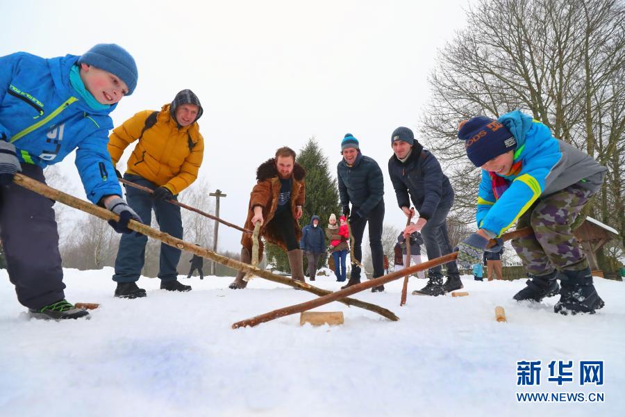 1月24日,人們在白俄羅斯首都明斯克郊區的民族建筑博物館參與傳統的冰雪游戲。新華社發(任科夫攝)