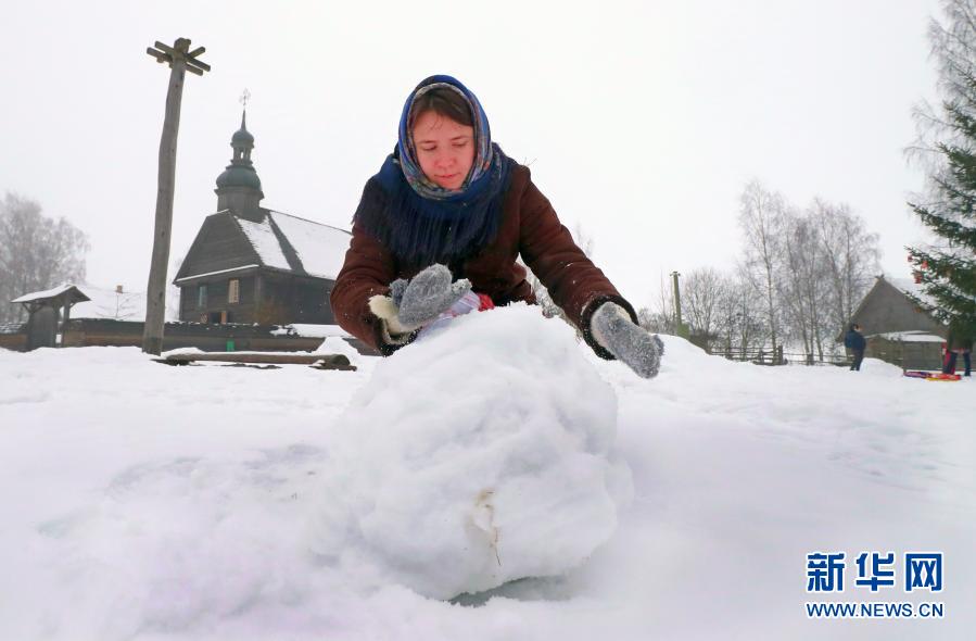 1月24日,一名女士在白俄羅斯首都明斯克郊區的民族建筑博物館內滾雪球。新華社發(任科夫攝)