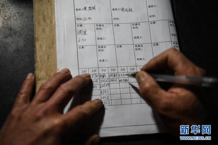 看守工廖成根在避車洞內記錄當天值班情況(1月30日攝)。