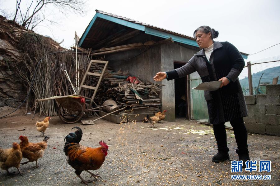 1月29日,在湖南省瀘溪縣浦市鎮麻溪口村,蔣四妹在喂雞。