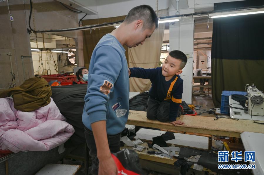 1月26日,在福建省石獅市的金利萊斯服裝廠,聰聰幫黃海龍拍掉粘在衣服上的棉絮。