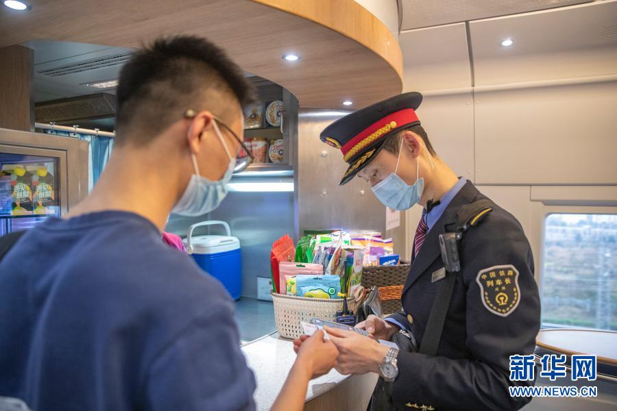 2月9日,在重慶北開往萬州北的C6422次列車上,付寶印為一名旅客辦理補票業(yè)務(wù)。新華社記者 黃偉 攝