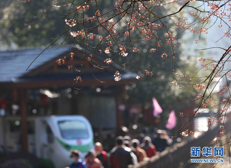 2月14日,游客在湖南張家界武陵源景區十里畫廊觀賞櫻花。新華社發(吳勇兵 攝)