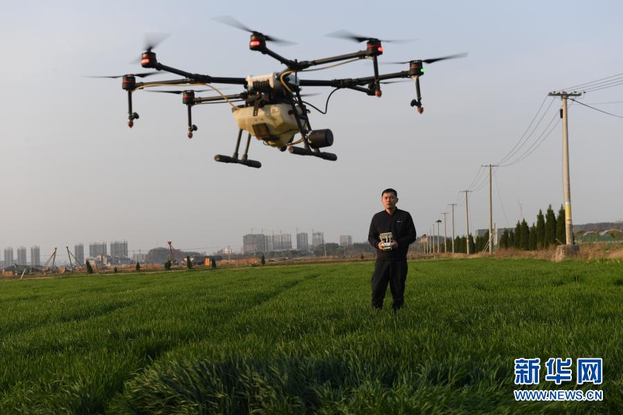 2月23日,湖州錢山下糧油專業合作社工作人員操縱無人機給小麥噴施農藥。立春過后氣溫回升,浙江省湖州市吳興區道場鄉全力開展春耕工作。今年該鄉計劃播種農作物總面積1.2萬畝,其中水稻5000畝、小麥2000畝。新華社記者 翁忻旸 攝