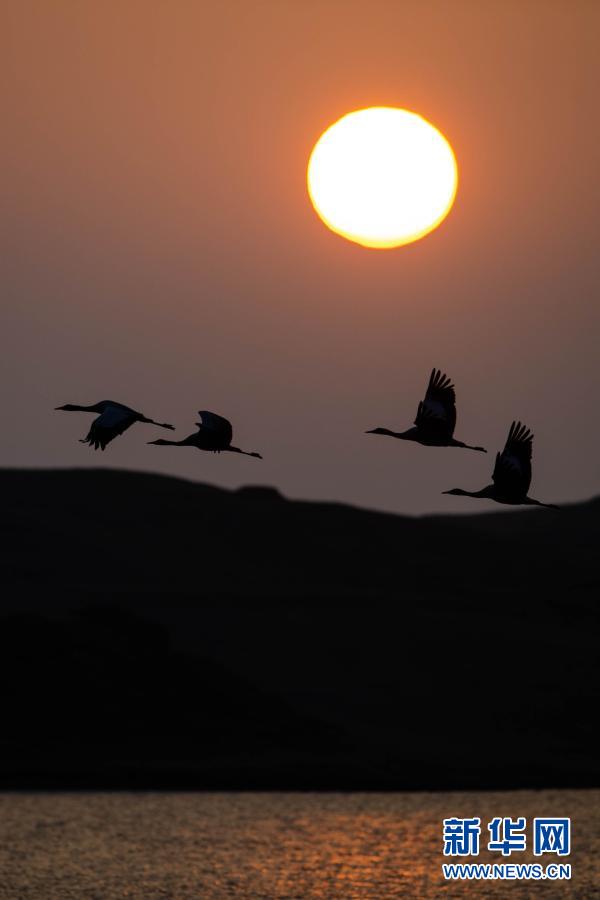 日出時分,黑頸鶴在大山包黑頸鶴國家級自然保護區飛翔(2月27日攝)。新華社記者 胡超 攝