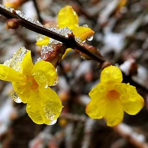 3月1日在北京中國人民革命軍事博物館附近拍攝的被冰雪覆蓋的迎春花。