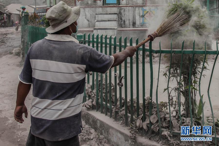 3月2日,印度尼西亞北蘇門答臘省卡羅的居民清除錫納朋火山噴發(fā)出的火山灰。