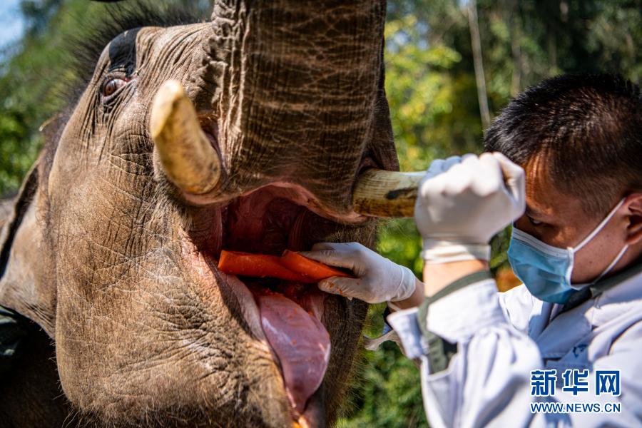 “象爸爸”為一頭名叫“小強(qiáng)”的大象檢查口腔(3月6日攝)。新華社記者 江文耀 攝