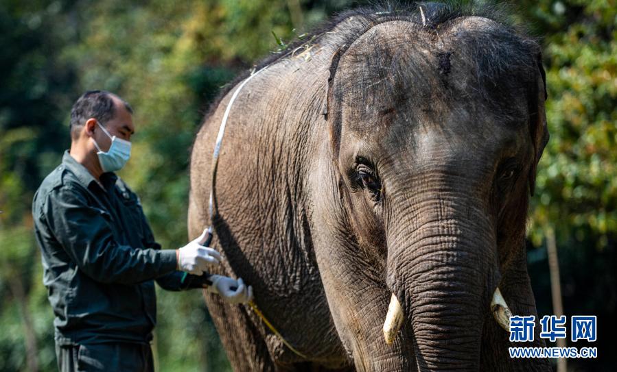 “象爸爸”為一頭名叫“小強”的大象測量腹圍(3月6日攝)。新華社記者 江文耀 攝