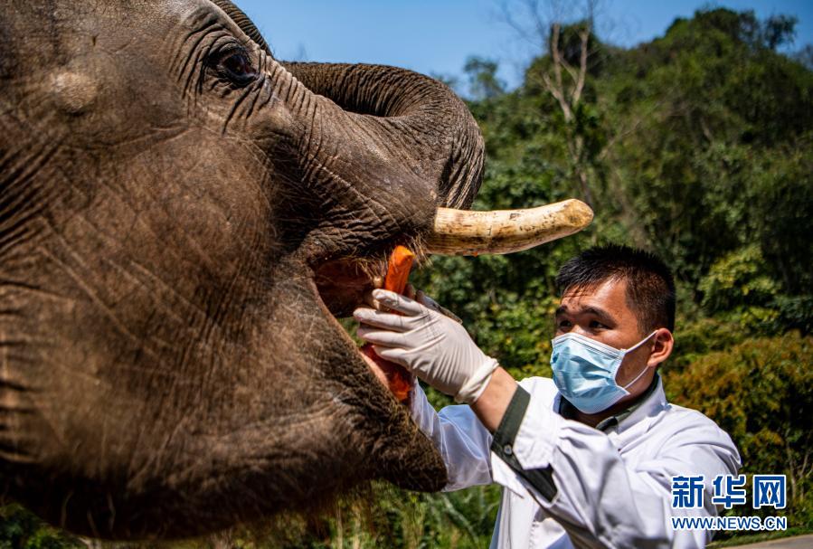 “象爸爸”為一頭名叫“小強(qiáng)”的大象檢查口腔(3月6日攝)。新華社記者 江文耀 攝
