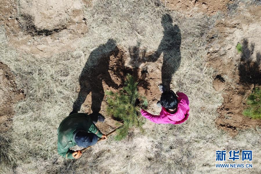3月11日,在平?jīng)鍪嗅轻紖^(qū)白水鎮(zhèn)焦莊村北山,張文玉(右)現(xiàn)場指導(dǎo)工人種植油松(無人機(jī)照片)。