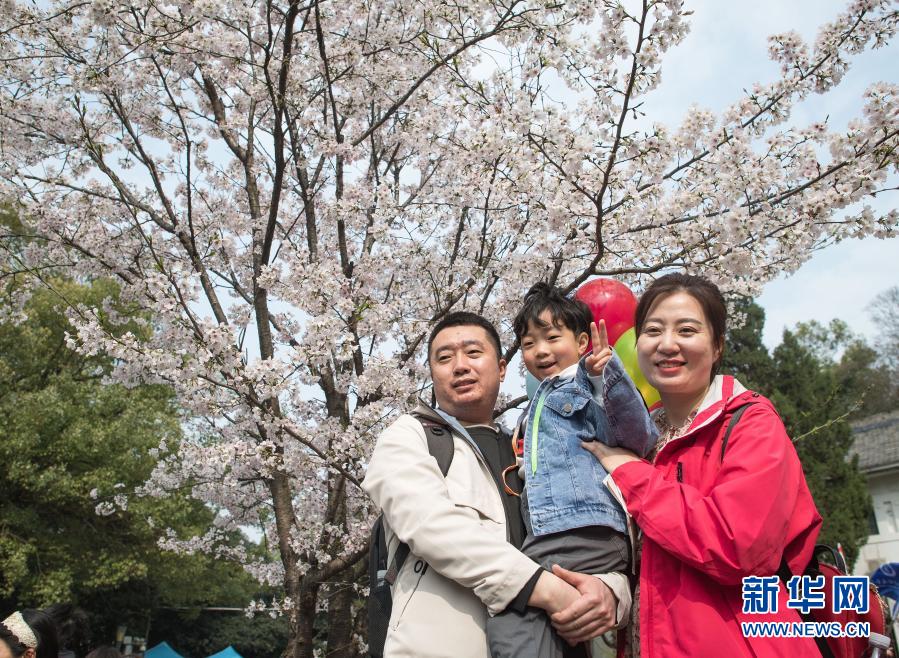 3月13日,遼寧援鄂醫療隊丹東市中心醫院護士李杰(右)與家人在武漢大學櫻花樹下合影。新華社記者 肖藝九 攝