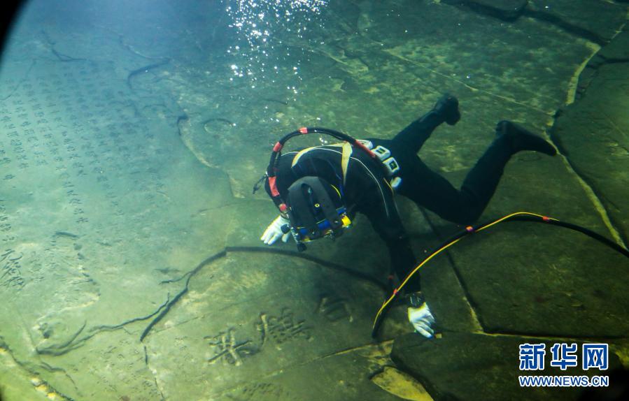 3月15日,在長江水下40多米的白鶴梁題刻無壓容器罩內,潛水員在進行清理作業。新華社記者 劉潺 攝