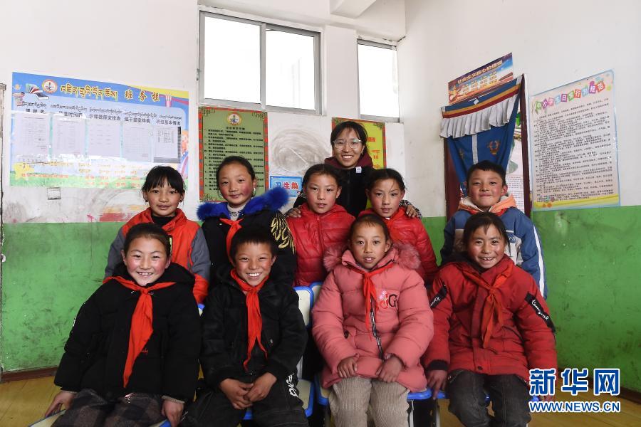 3月16日,在索加鄉寄宿小學,達哇才吉老師(后排中)和學生在一起。新華社記者 韓方方 攝