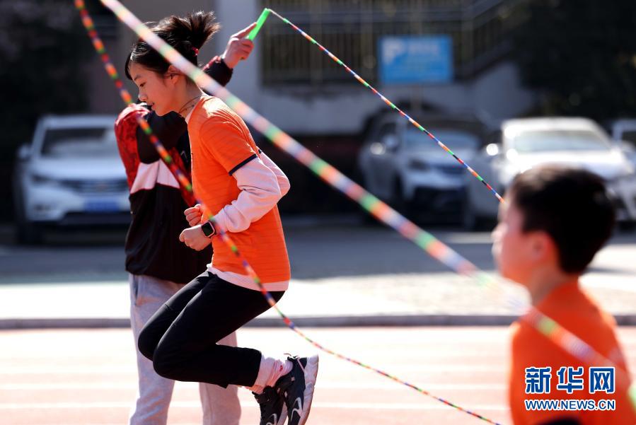 3月23日,在合肥市大通路小學新海校區,學生在大課間練習花樣跳繩。