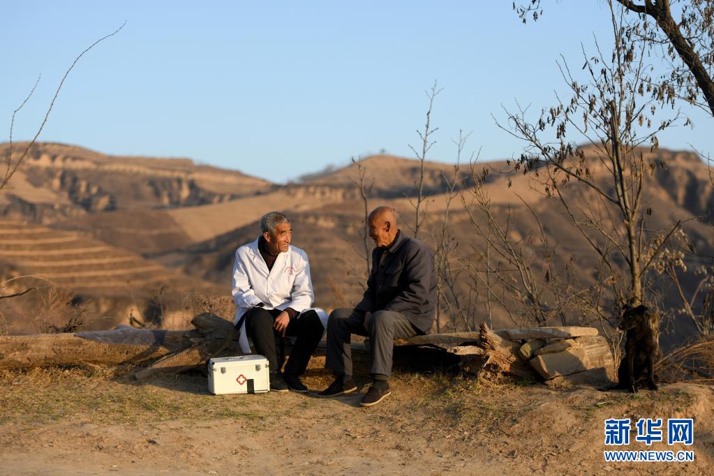 在山西省石樓縣鐵頭村張家灣自然村,張尚保(左)在詢問村民的身體情況(3月23日攝)。新華社發(劉亮亮 攝)