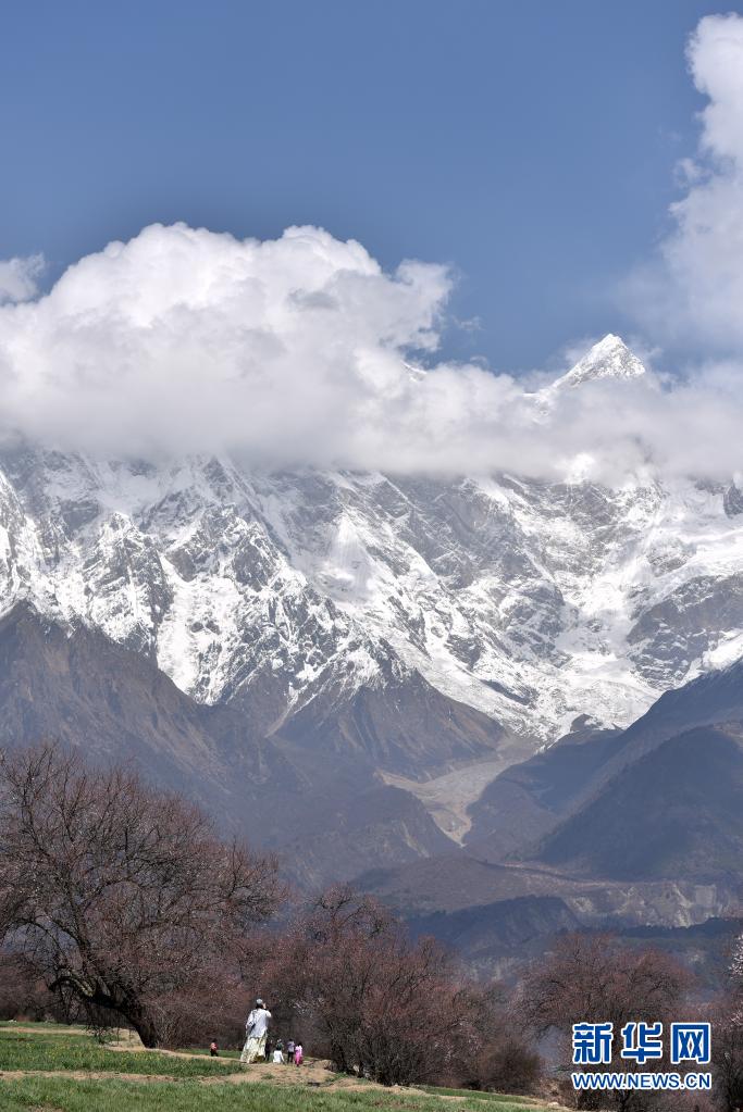 3月28日,游客在西藏自治區林芝市索松村欣賞與雪山相映的桃花。新華社記者 孫瑞博 攝