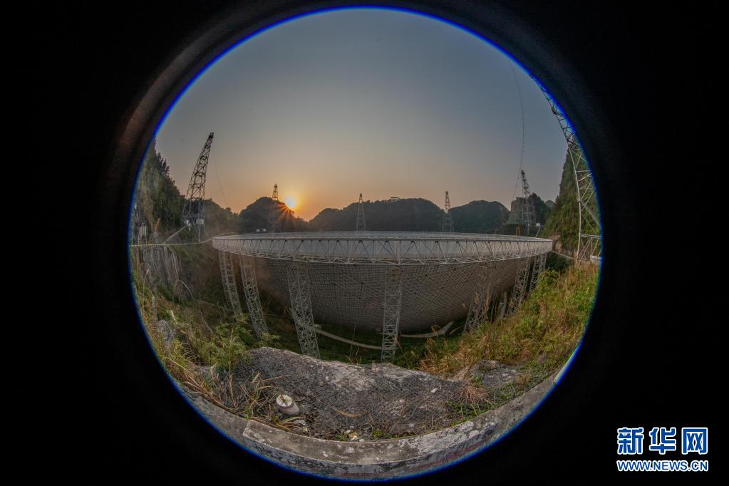 3月29日拍攝的晚霞中的“中國天眼”全景(維護保養期間魚眼鏡頭拍攝)。
