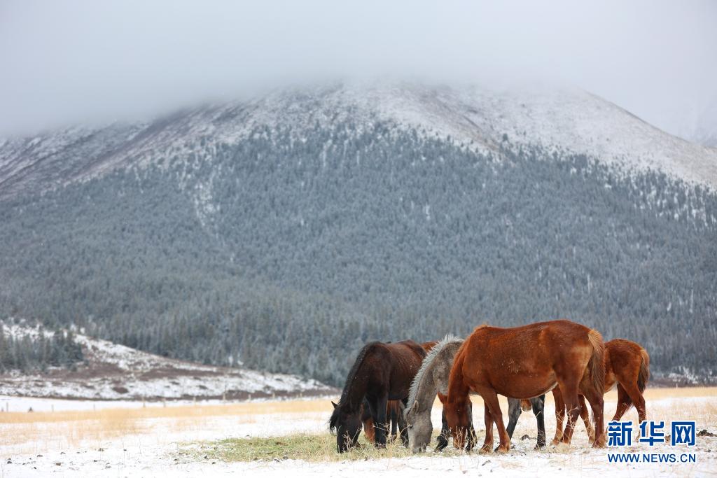 當日,受冷空氣影響,位于甘肅省河西走廊中部、祁連山北麓的山丹馬場降雪,馬群在雪原上奔跑覓食,構成了一幅壯美高原雪景 。