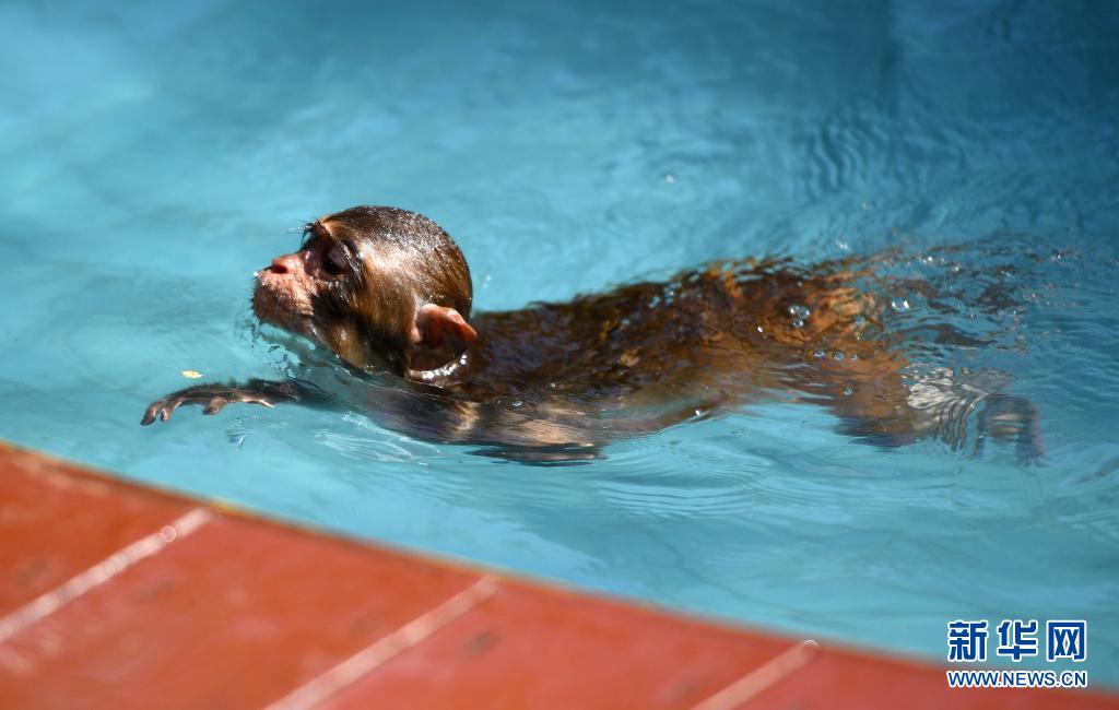 4月4日,獼猴在南灣猴島保護區里戲水。