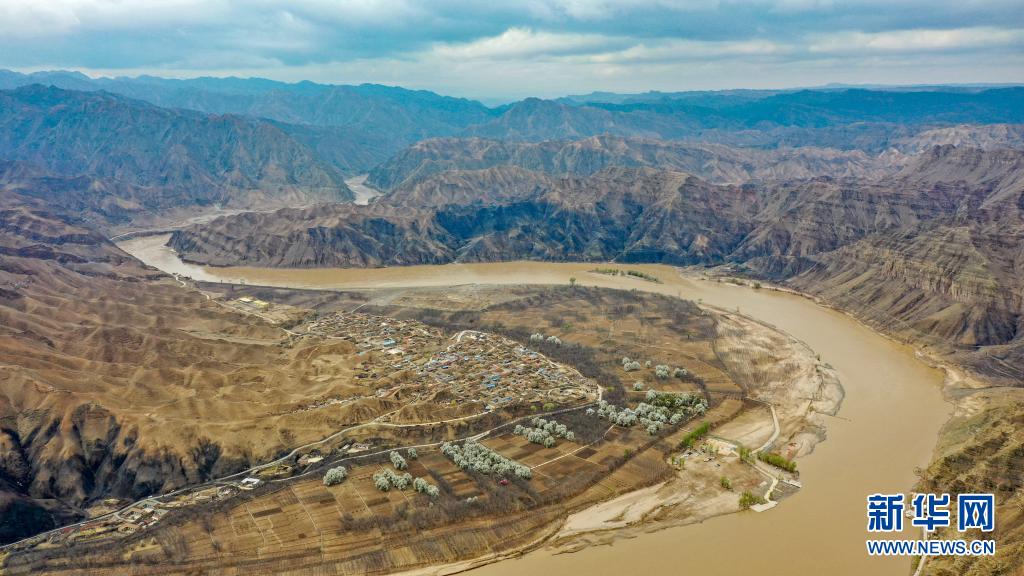 這是位于寧夏中衛(wèi)市黃河黑山峽河段的南長灘村(4月4日攝,無人機(jī)照片)。