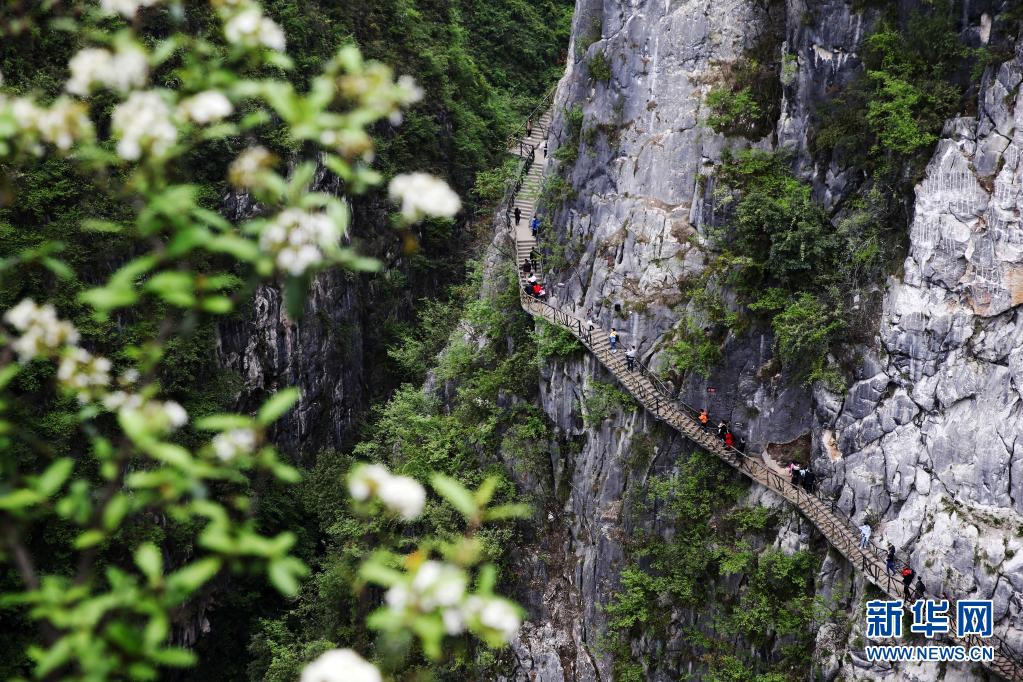 4月5日,游客在重慶市黔江區城市大峽谷景區懸崖棧道游玩。