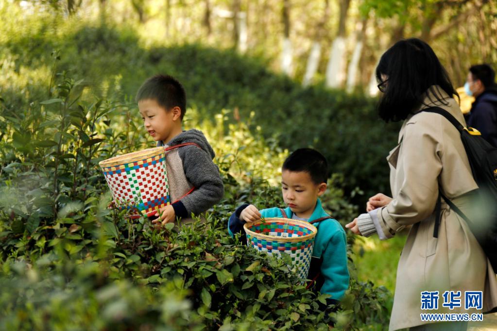 4月5日,家長陪伴孩子在南京科技館茶園體驗采茶。