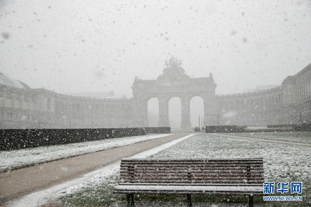 這是4月6日在比利時布魯塞爾五十周年紀念公園拍攝的雪景。