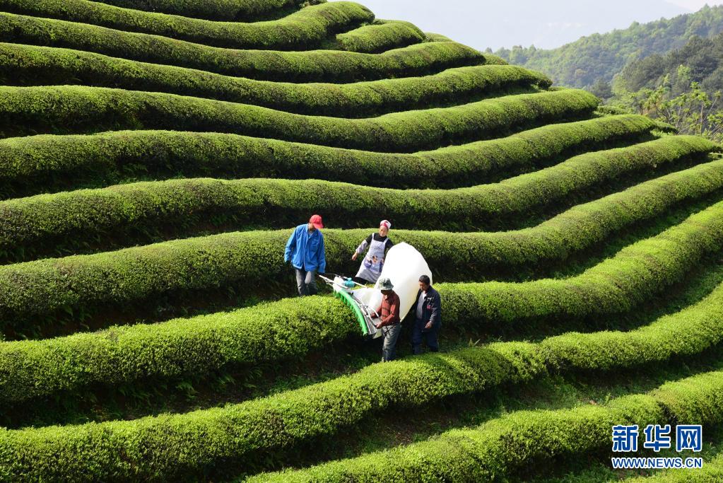 4月6日,浙江杭州建德市的茶農操作采茶機采收春茶青葉。