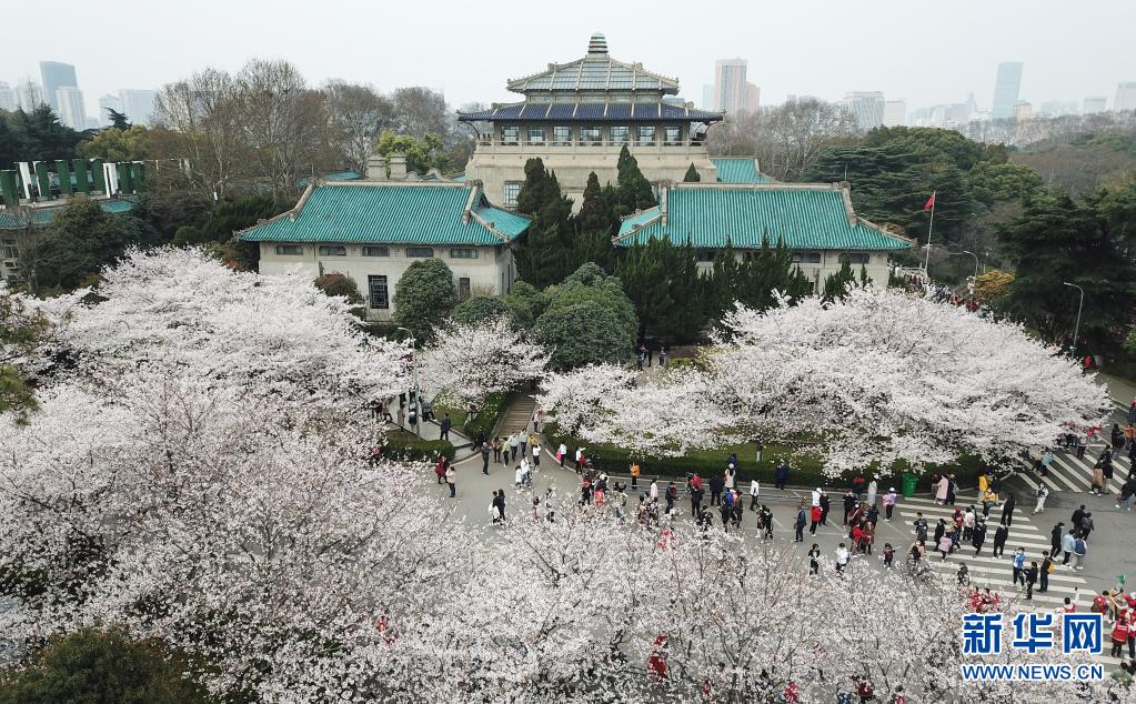 3月13日,武漢大學抗疫醫(yī)護人員賞櫻專場啟動,來自全國各地的援鄂抗疫英雄在櫻花樹下重逢,盡享櫻花之約(無人機照片)。新華社記者 程敏 攝
