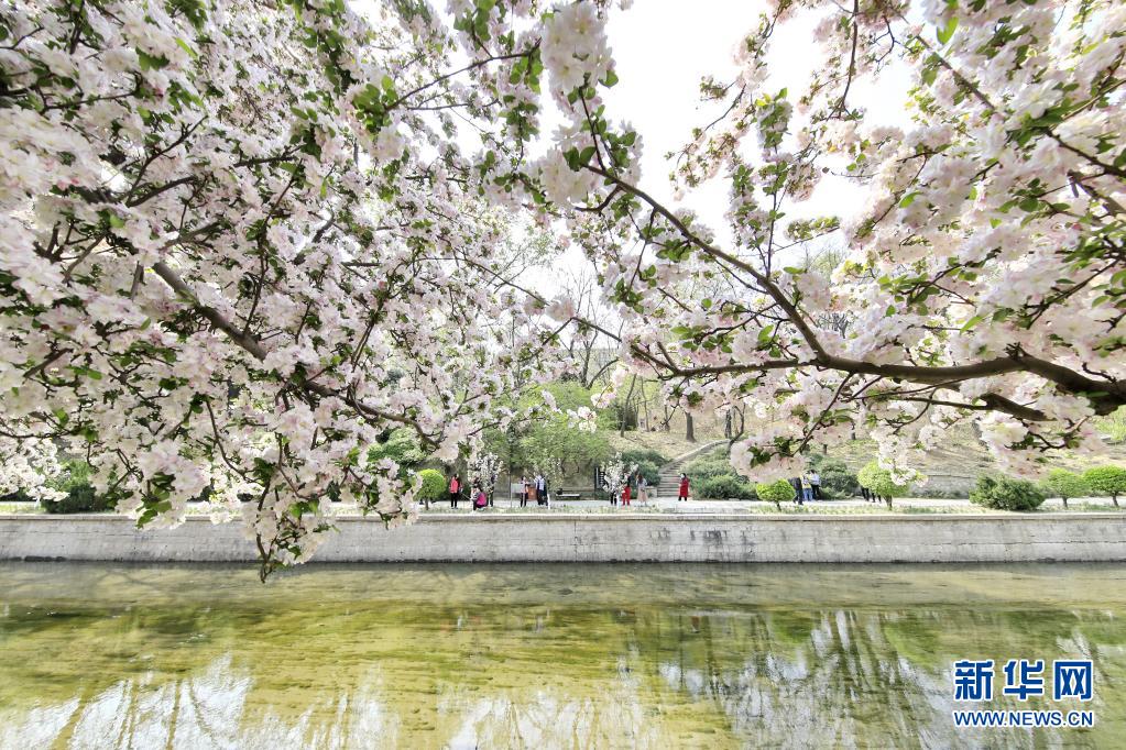 4月8日,游人在北京元大都遺址公園海棠花溪景區賞花。