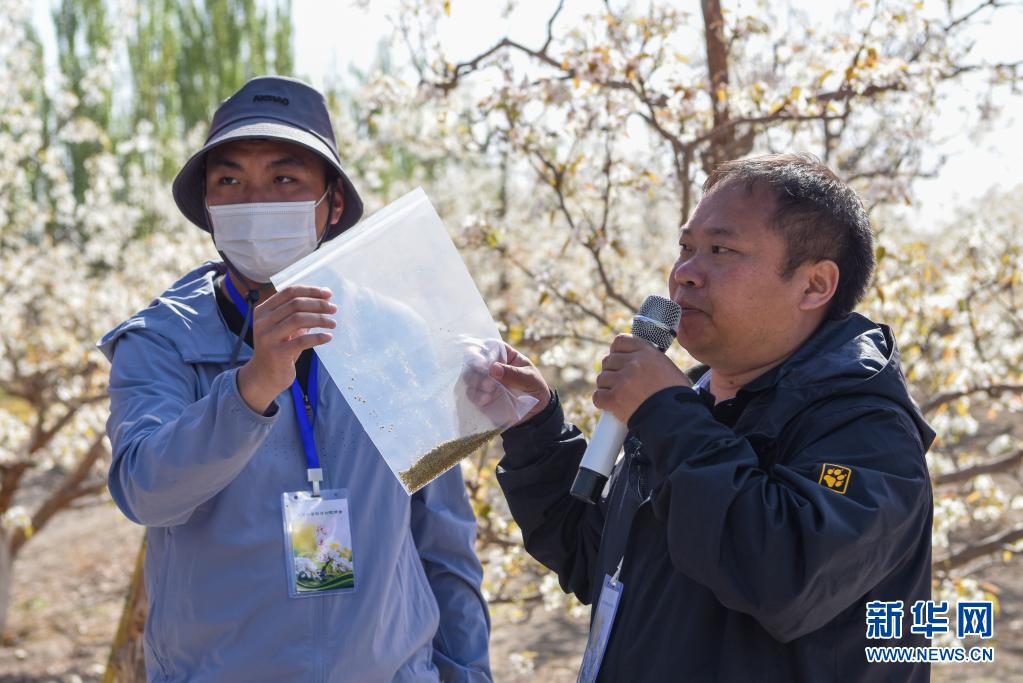 4月11日,在鐵門關市一處香梨示范園,技術人員展示蜜蜂采集的高活性花粉。新華社記者 丁磊 攝