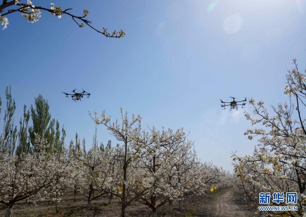 4月11日,在鐵門關市一處香梨示范園,植保無人機進行授粉作業。新華社記者 丁磊 攝