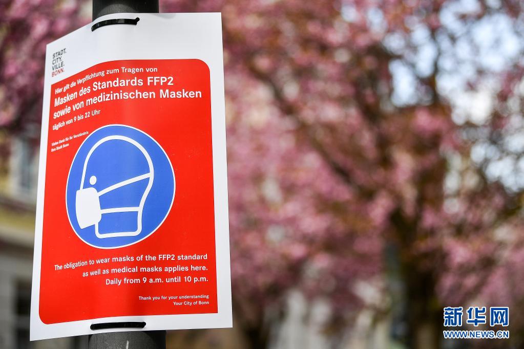 4月13日,德國波恩老城區的櫻花樹下張貼著提示游人佩戴醫用口罩的標識。