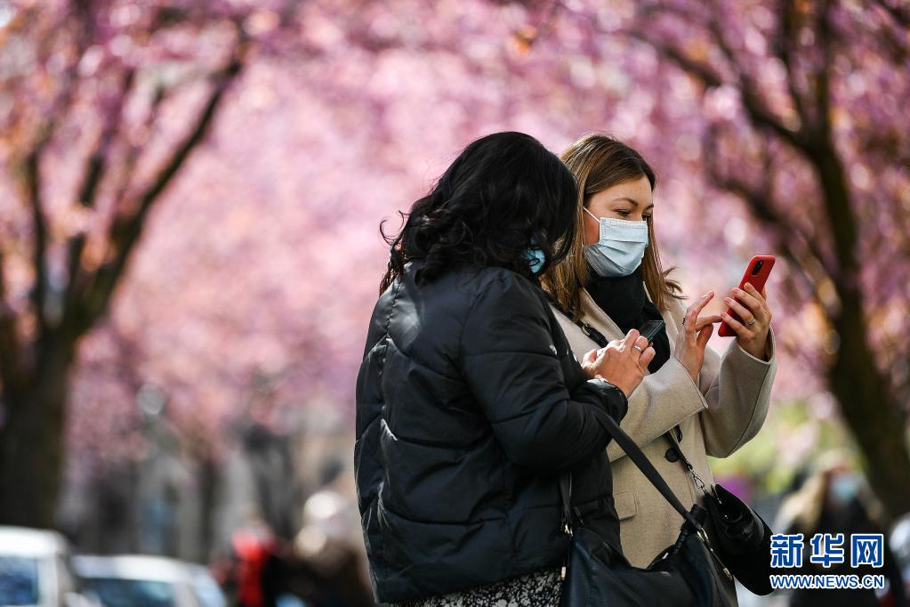 近日,德國西部城市波恩老城區的櫻花盛開,吸引了許多游人前來觀賞。