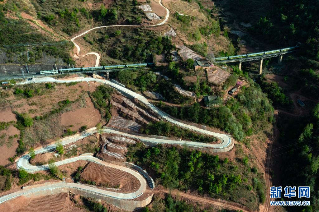 這是即將抵達成昆鐵路沙馬拉達站的5634次列車和通站公路(4月11日攝,無人機照片)。