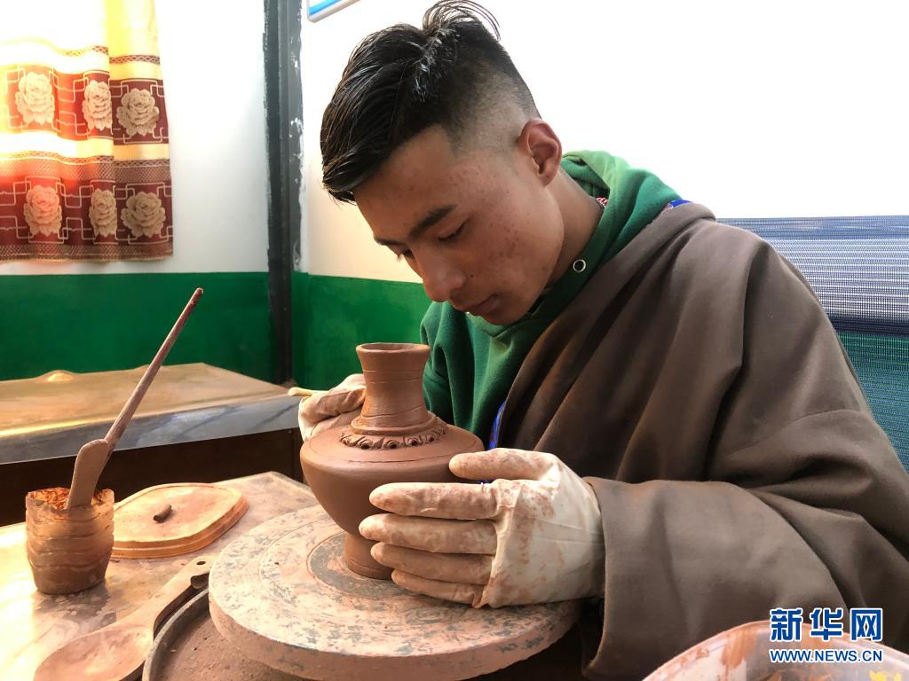 青海省玉樹藏族自治州囊謙縣吉曲鄉山榮村村民在扶貧產業園內制作黑陶(2020年7月4日攝)。