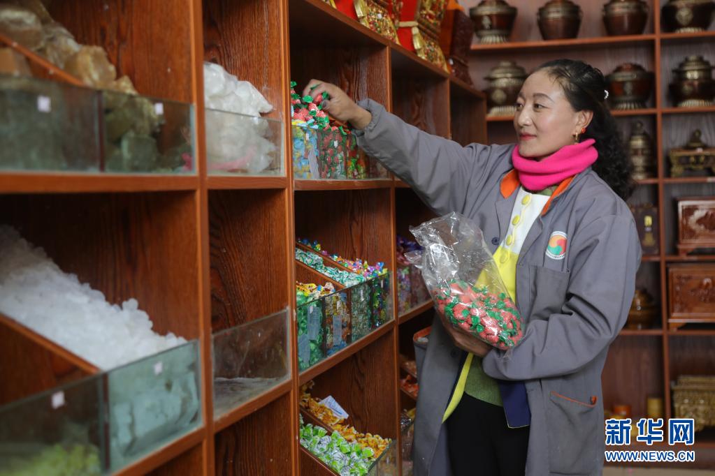 在青海省玉樹藏族自治州玉樹市甘達村利眾專業綜合合作社,超市售貨員才仁卓尕在整理貨架商品(4月10日攝)。