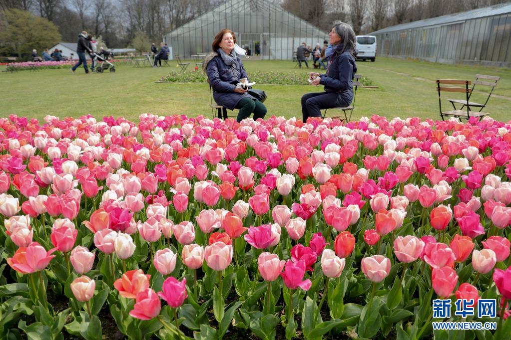 4月14日,參觀(guān)者坐在比利時(shí)布魯塞爾以西的拜加登城堡的鮮花旁休息聊天。