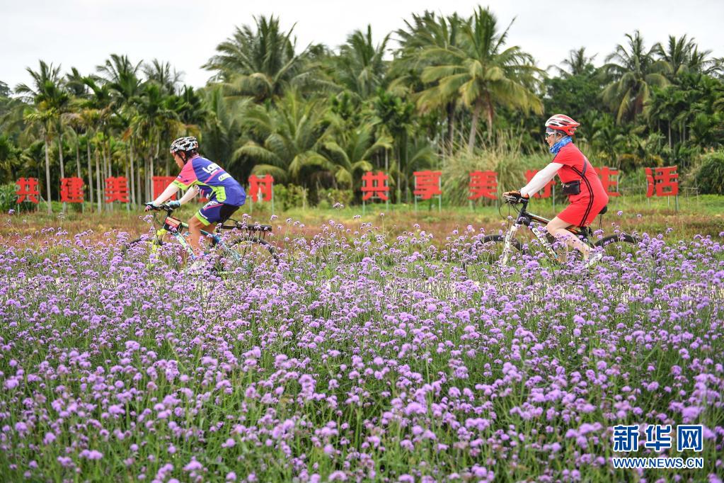 4月9日,游客在海南博鰲鎮南強村花海中騎行。