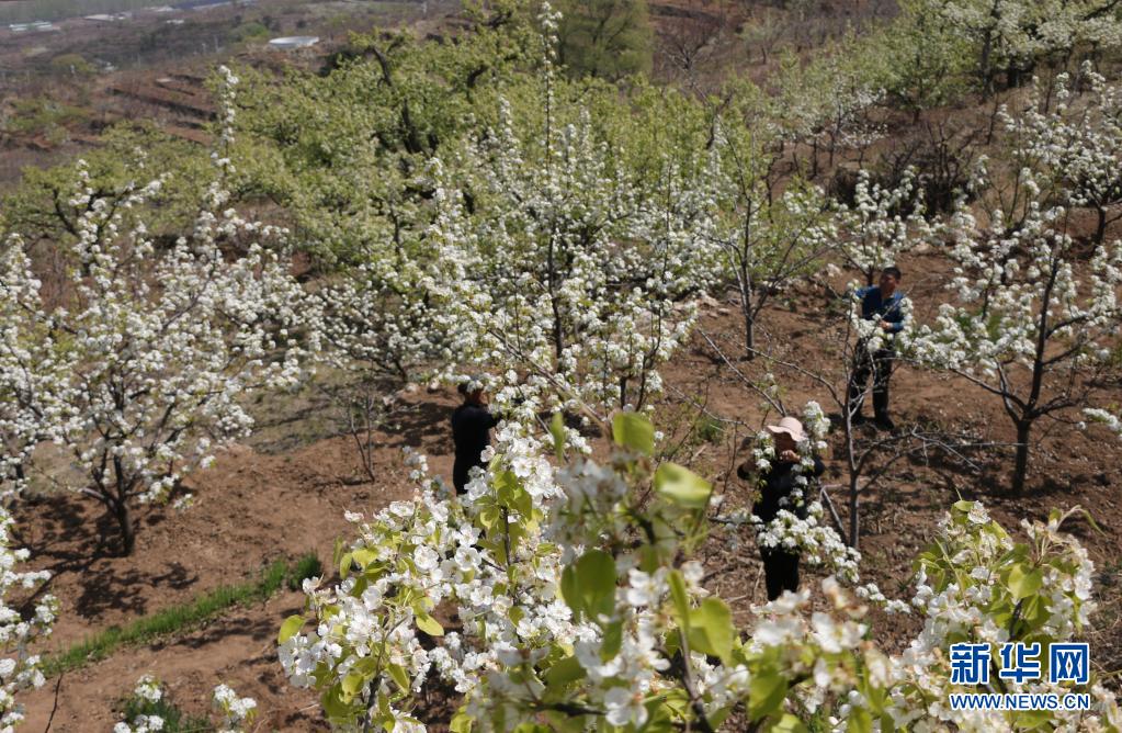 4月19日,農民在河北省承德縣新杖子鎮葦子峪村梨園為梨樹疏花。