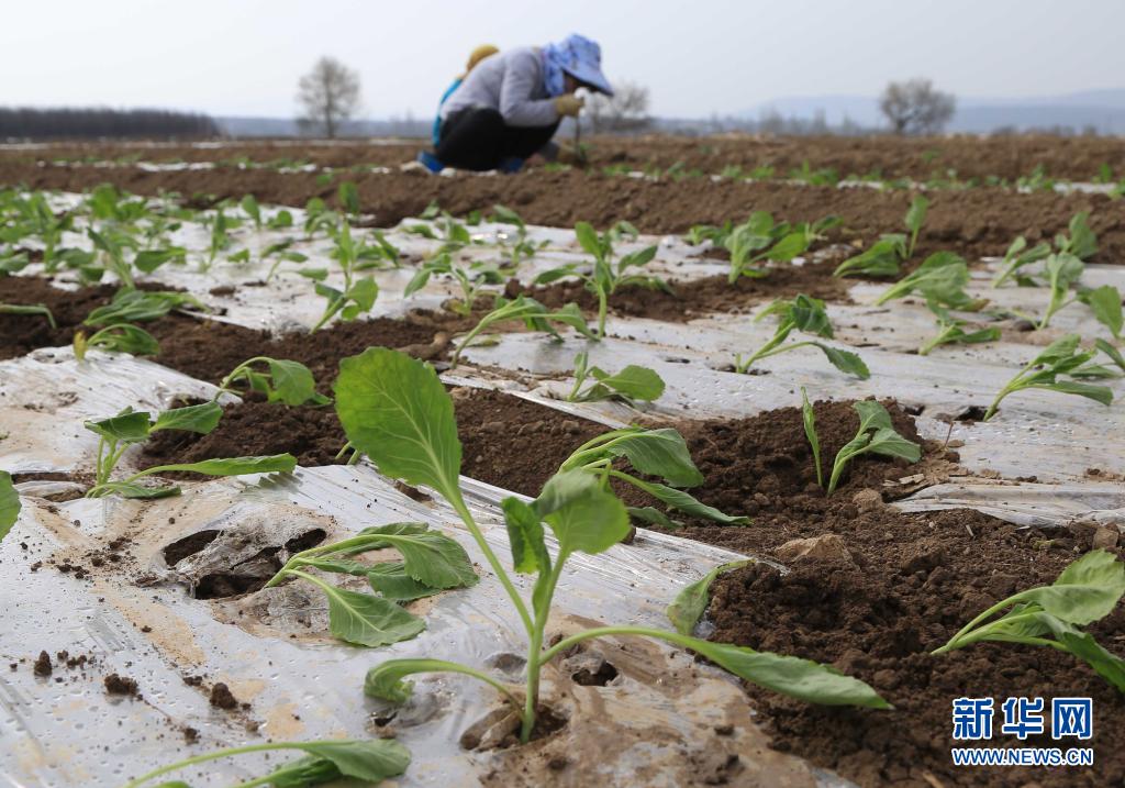 4月20日,甘肅省定西市安定區香泉鎮農民在移栽甘藍苗。