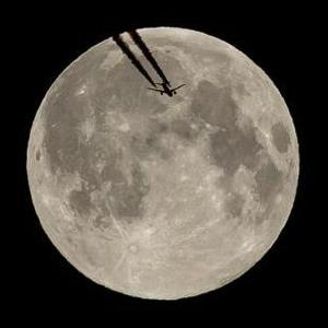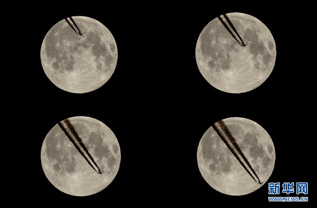 4月27日,一架飛機“飛過”法國巴黎上空的“超級月亮”(拼版照片)。新華社發(奧雷利安·莫里薩爾攝)
